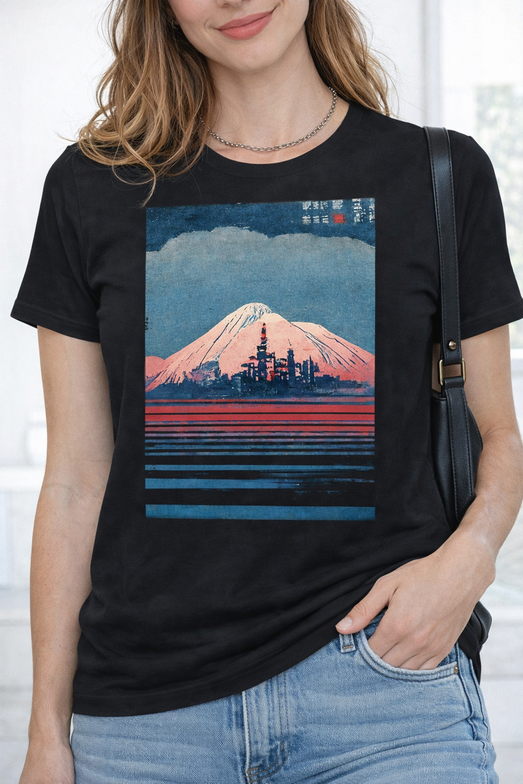 Experience the serene beauty of Japan’s most iconic landmark with our Mount Fuji Horizon Graphic Tee. This design showcases a majestic snow-capped Mount Fuji rising above a stylized urban horizon and tranquil blue waters. Blending the timeless look of traditional woodblock prints with a modern color palette of deep blues and sunset reds, this tee is a perfect tribute to Japanese landscape art.